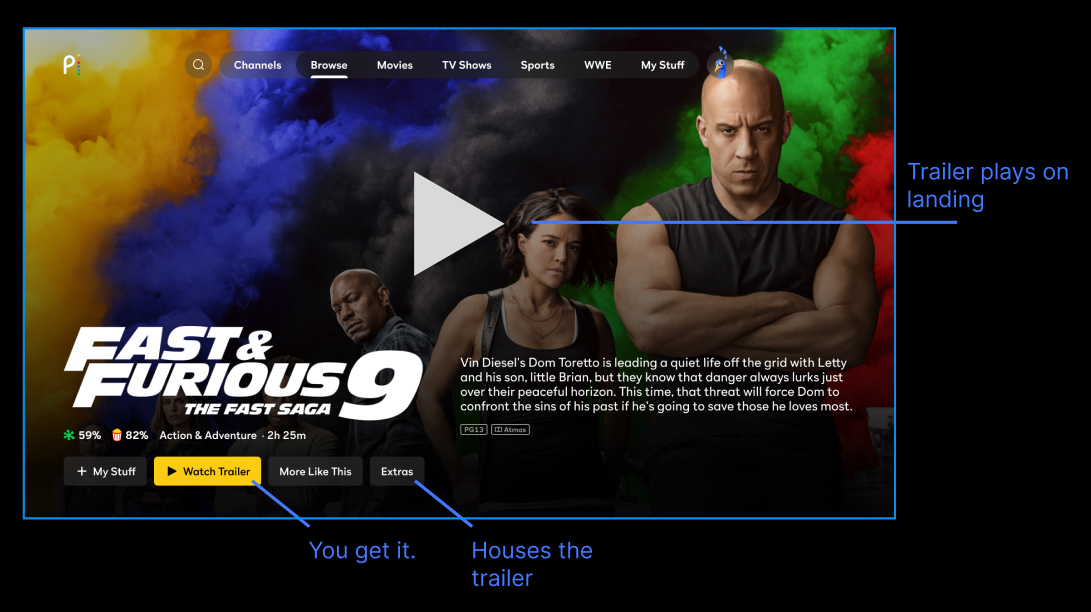 With data in hand we drafted up the final iteration. An Upcoming PDP with its own availability tag metadata field, an extras tab that only exists if there are extras and a CTA that help the user choose to add to watch list while they automatically interact with the trailer!