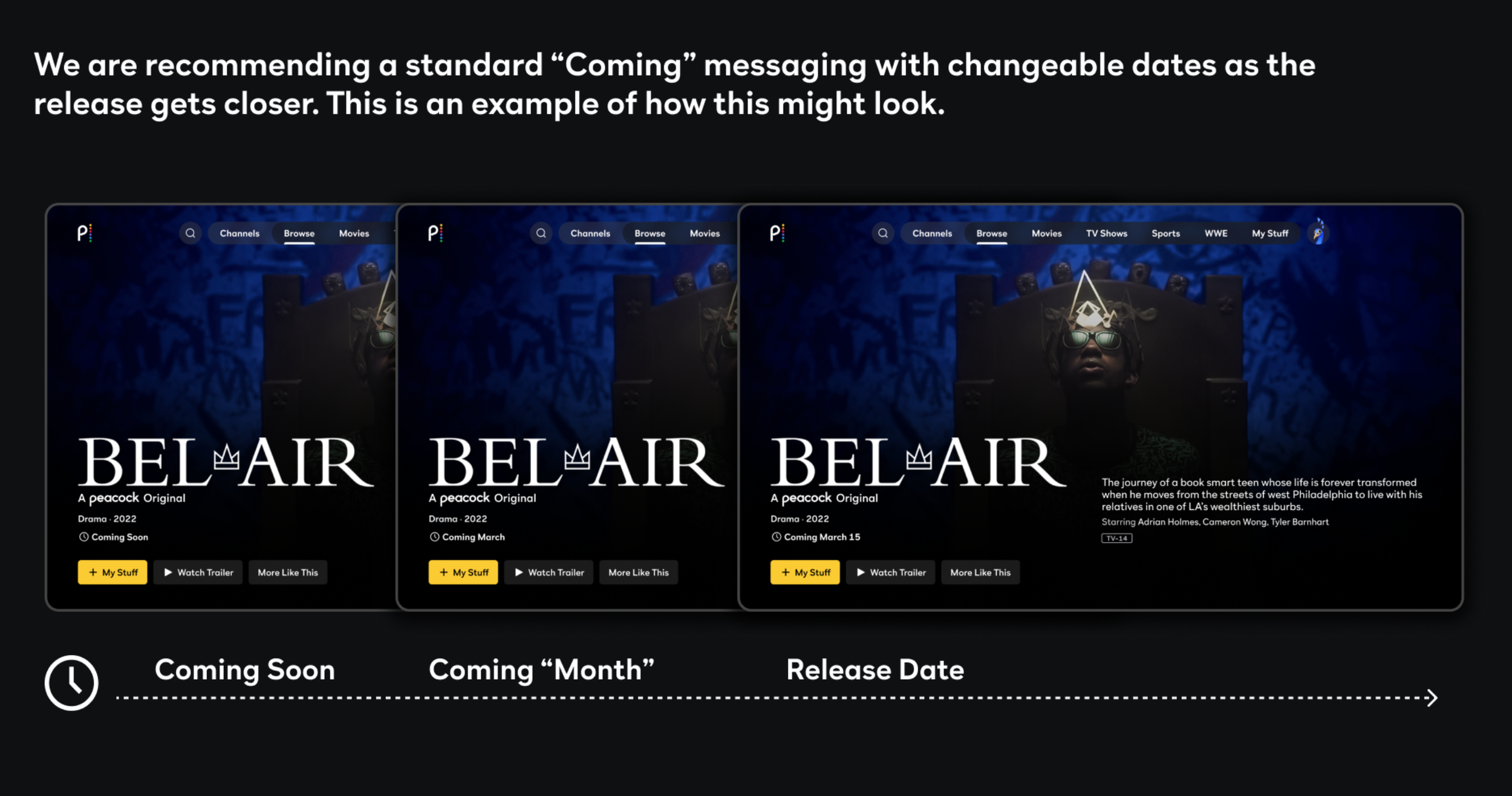 Problem: Content coming soon to Peacock does not have a PDP. Tech has built a makeshift workaround PDP but needs proper design. Designs for Upcoming PDP need to be ready ASAP.